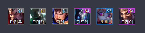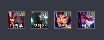 1코인 챔프인 가렌,모데,다리우스는 최대한 뽑아주고 원딜러 로는 베인을 뽑아주시면 됩니다.