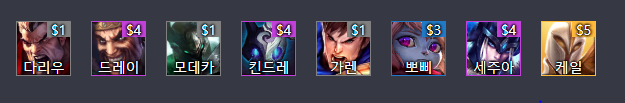 그리고 7~8렙때 쯤이면 1코인 챔프인 다리,모데,가렌이 3성이 뽑힐 수 있는 시간이고