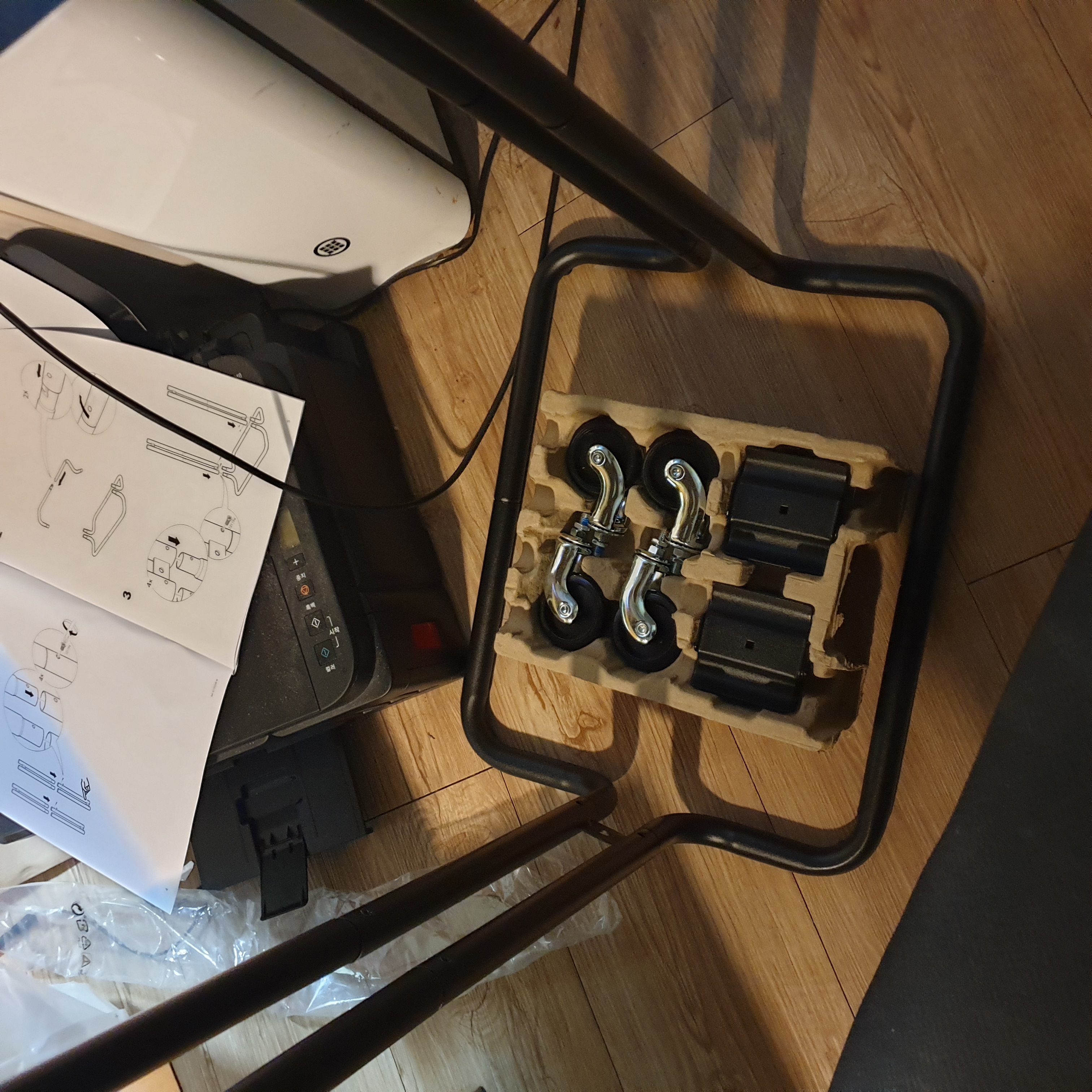 옆에 기둥세우고 선반 넣은다음에 다하고나서 아래쪽 바퀴 달아주면 끝납니다.