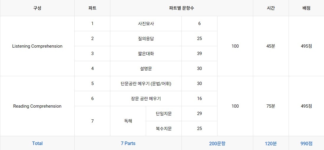 토익은 리딩 리스닝 100문항수 총 200문항으로 이뤄져있습니다. 시험시간도 2시간으로