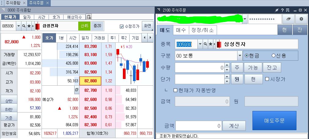 지금 현재 가격으로 구매를 한다는걸 뜻하게되고, 왼쪽에 보이는 숫자들중에 네모가 쳐진 82800원이 시장가입니다.