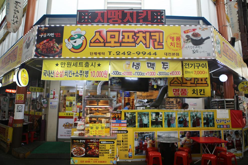 다다르다 독립서점에서 은행동을 구경하며 중앙시장으로 갈수있습니다. 중앙시장에서 시장 구경을 하며 지나가다 보면 스모프치킨을 볼 수있는데, 중앙시장을 갈떄면 늘 한마리씩 포장을 해옵니다. 좋아하는 이유는 후라이드가 너무 깔끔하게 잘 튀겨져 나와서 좋아합니다. 중앙시장 지나다 보면 맛있어 보이는 먹거리들이 많으니 이것저것 포장하고 치킨까지 포장해서 숙소에서 편하게 먹기 참 좋습니다.